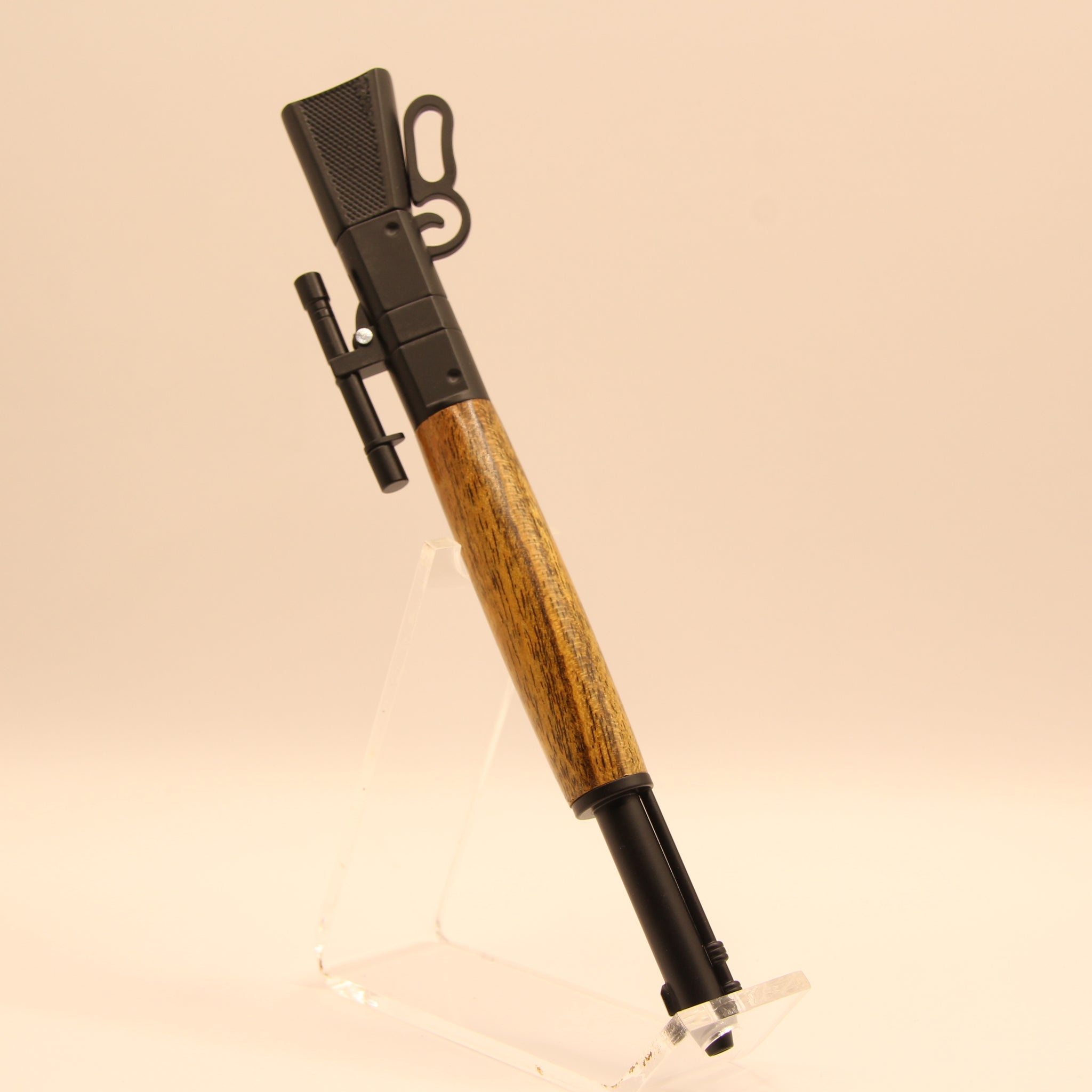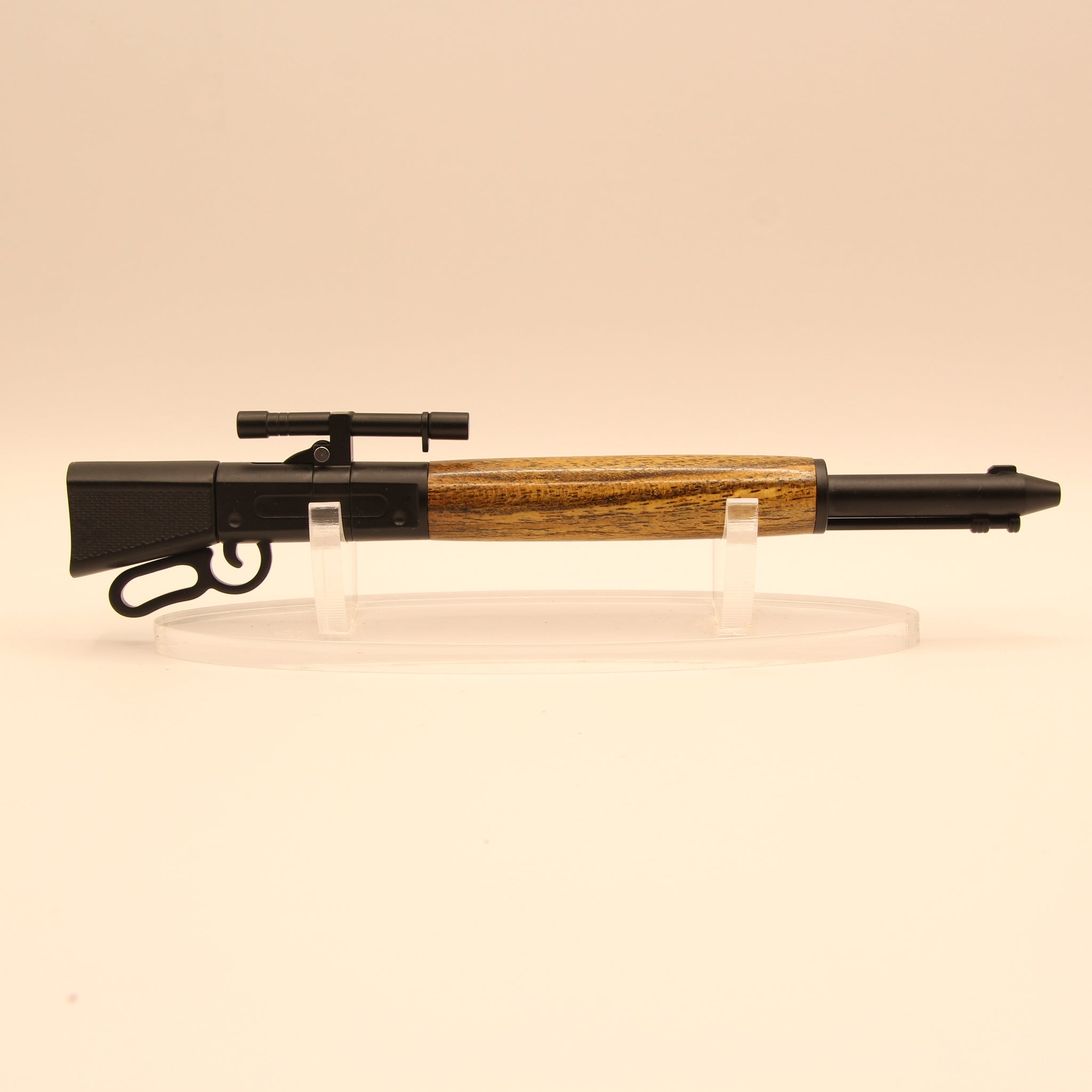 Scope & Barrel Details: The pen clip is a miniature rifle scope, while the tip is a detailed depiction of a rifle barrel, complete with a front sight, muzzle, and tubular magazine.