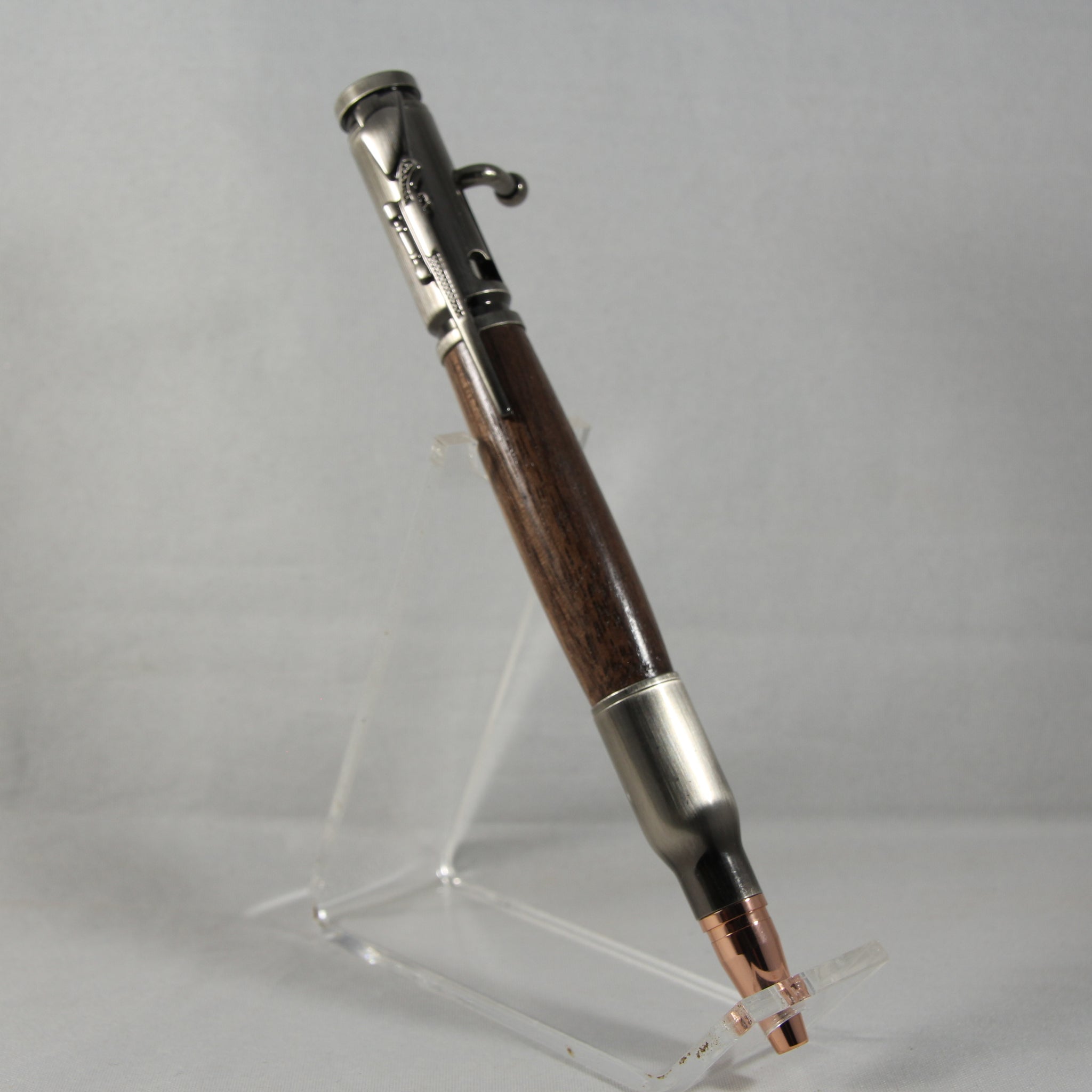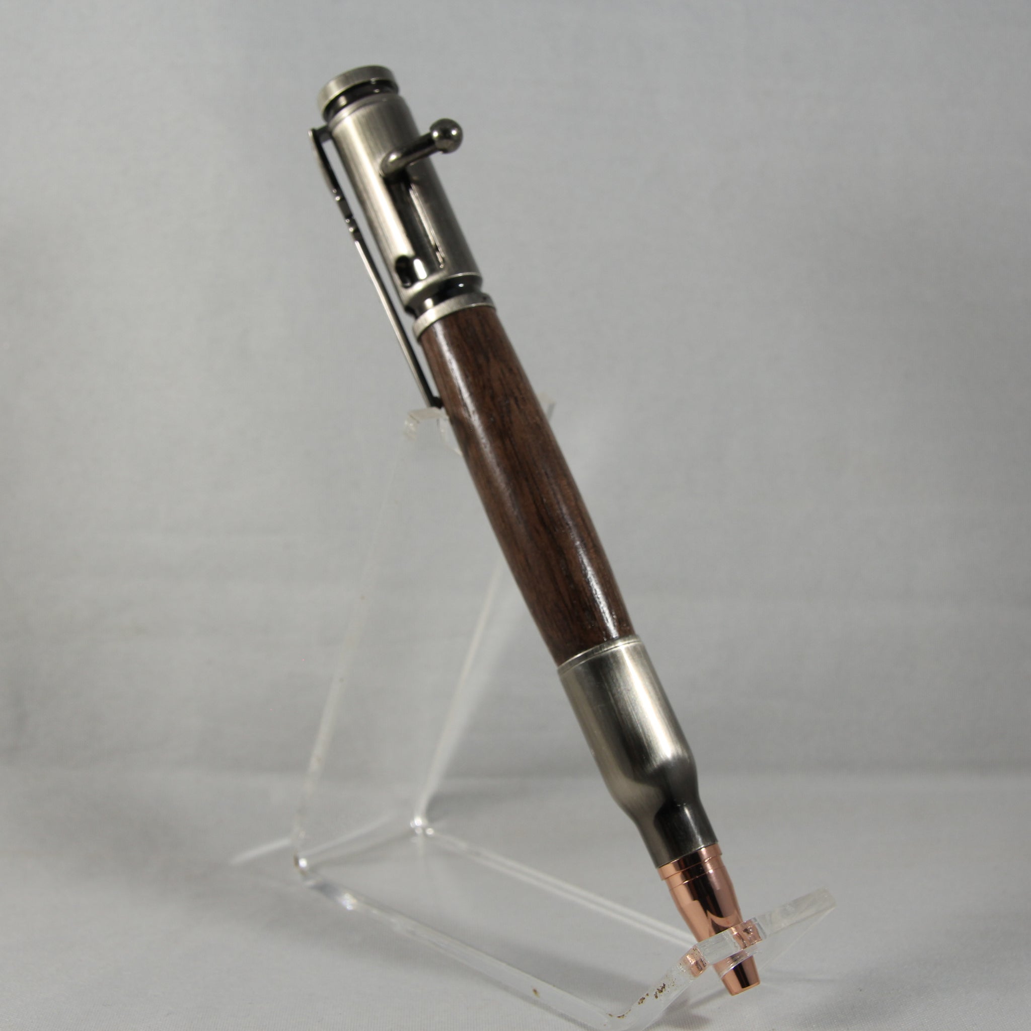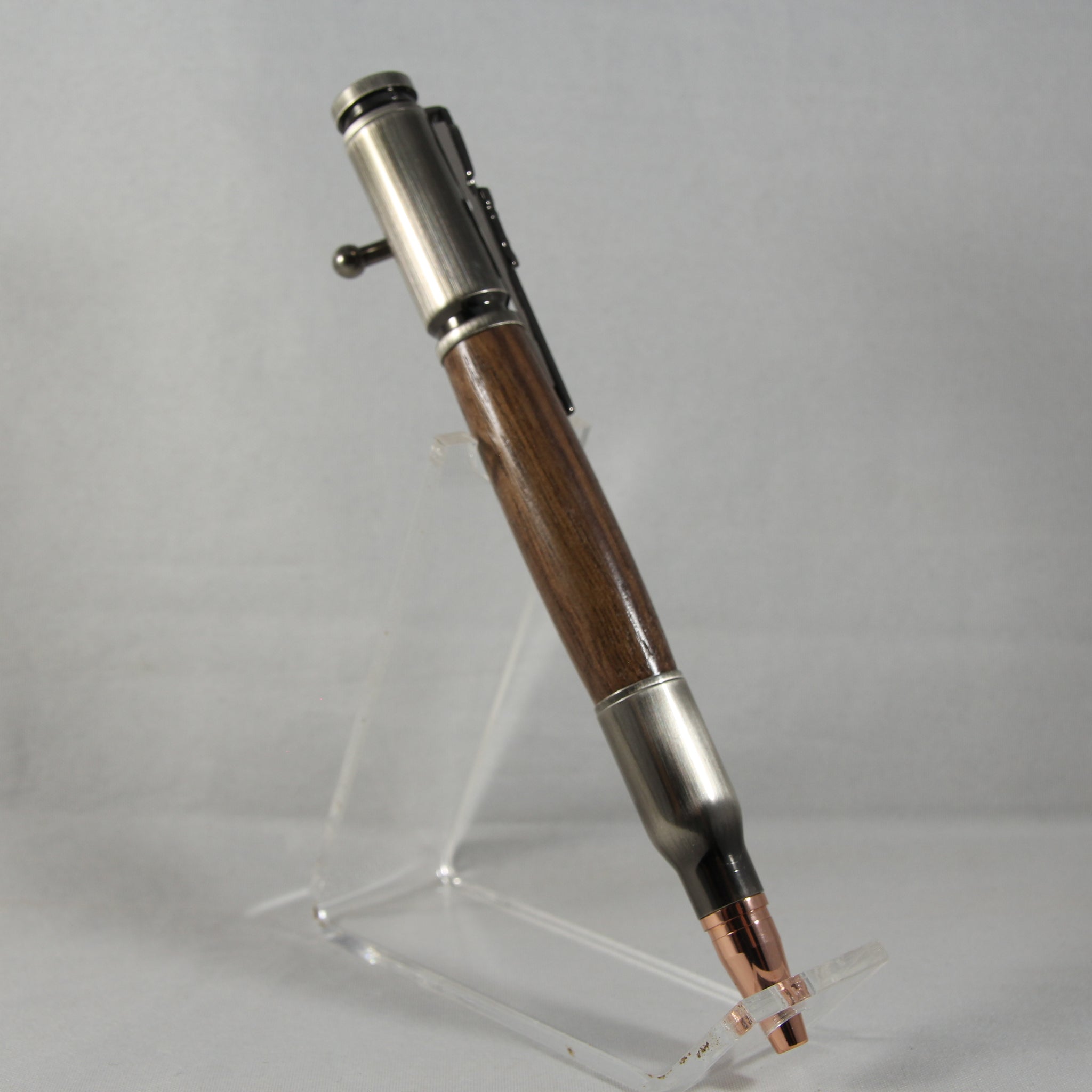 The Bolt Action pen is designed to ensure uniqueness and reliability. The realistic bolt-action will be hard for any hunting or target-shooting enthusiast to put down. The Bolt Action handle smoothly advances and retracts to securely lock the refill in place. Includes a bolt action rifle clip and a replica 30 caliber cartridge.