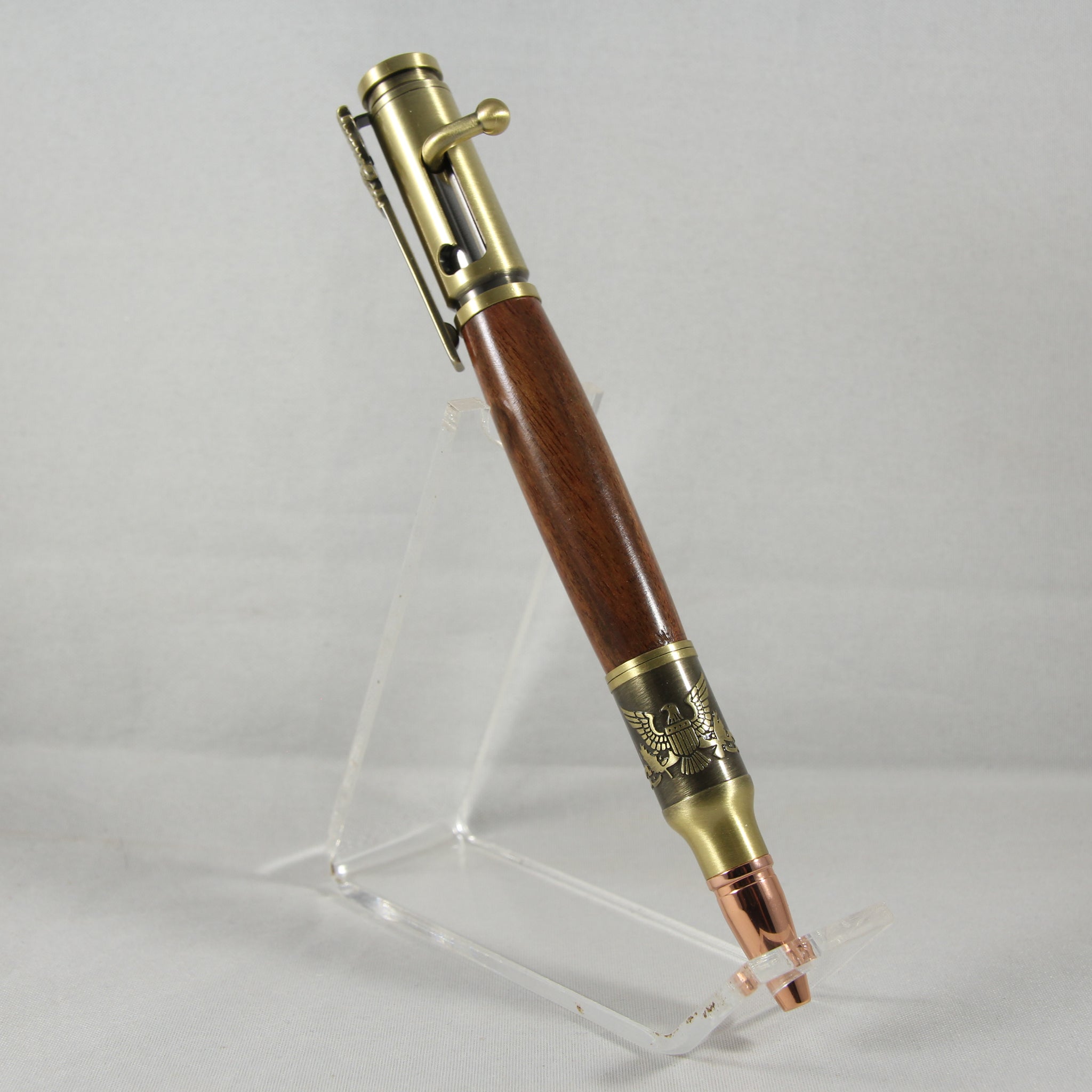 Give the gift of guns and country with this eye-catching and patriotic Statue of Liberty Flag pen kit. The pen features a handsome etched engraving of a Bald Eagle Insignia on on the tip and God Bless America stamped on the cap end. The patriotic theme is continued on the pen clip which features a red, white and blue American Flag and handsomely cast Bald Eagle emblem. The bolt action mechanism is the same as you'd find on our original and best selling bolt action pen kits and uses the same accessories. Plus, with its rich, warm copper finish and dark antique highlights, the details of this pen will surely impress. To honor the American Troops, Penn State Industries will donate one Slimline Pen Kit to the Freedom Pen Project for every Salute the Troops Pen Kit we sell. The Freedom pen project sends handmade pens to American servicemen and women overseas to show appreciation and support for their time and duty spent defending our country.