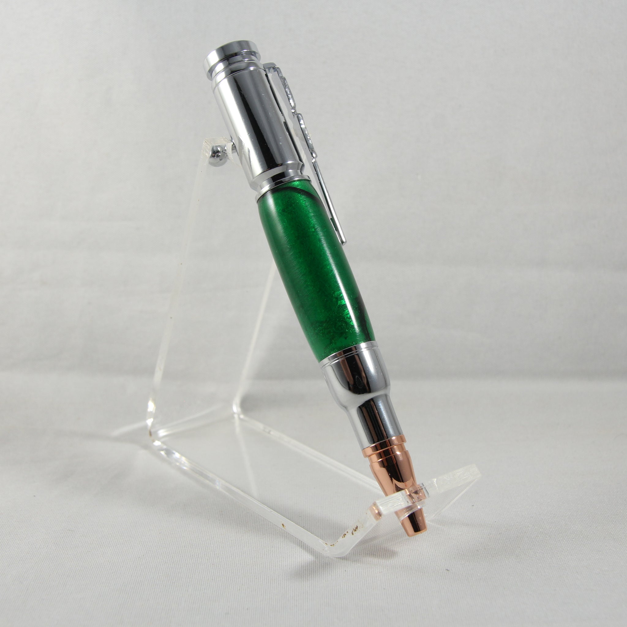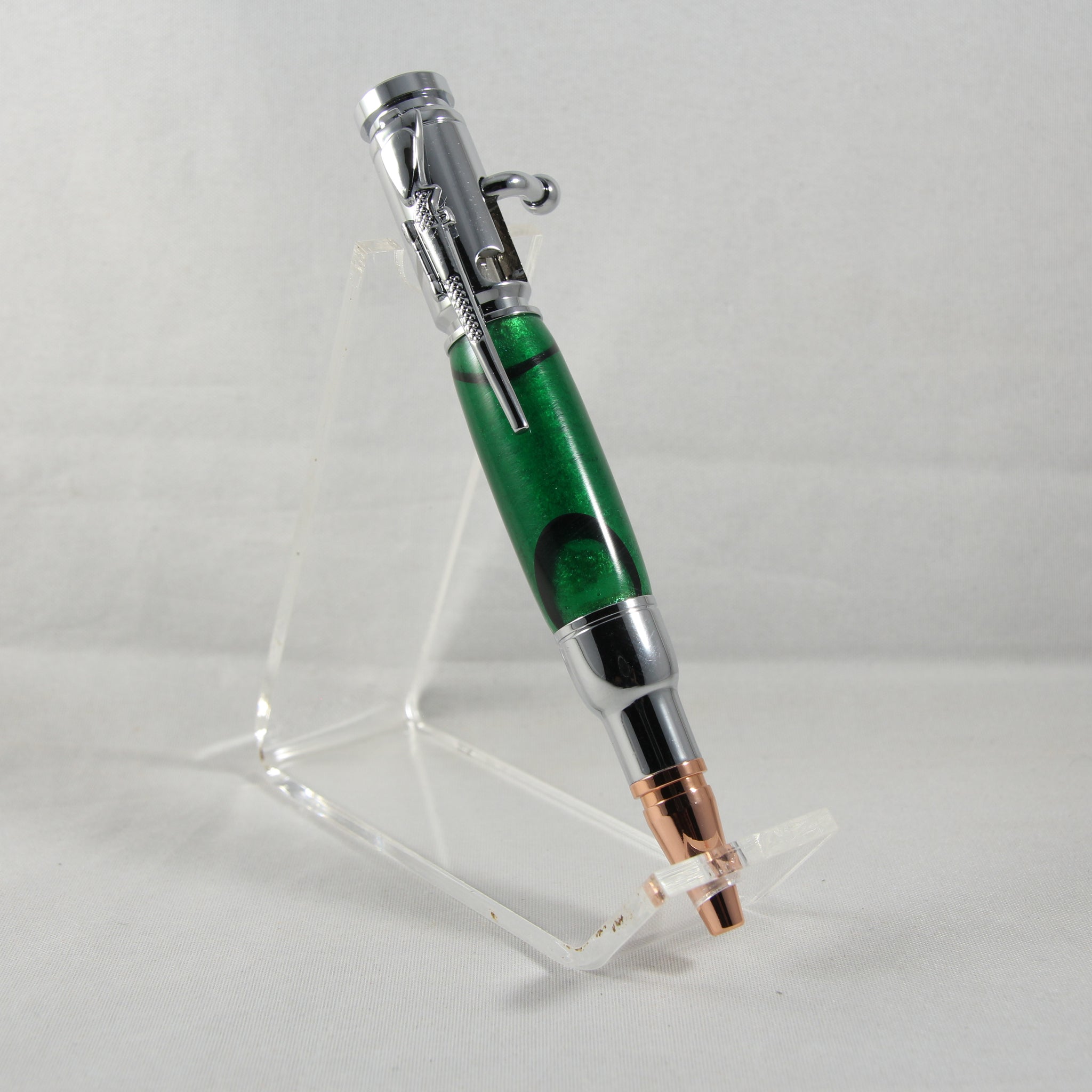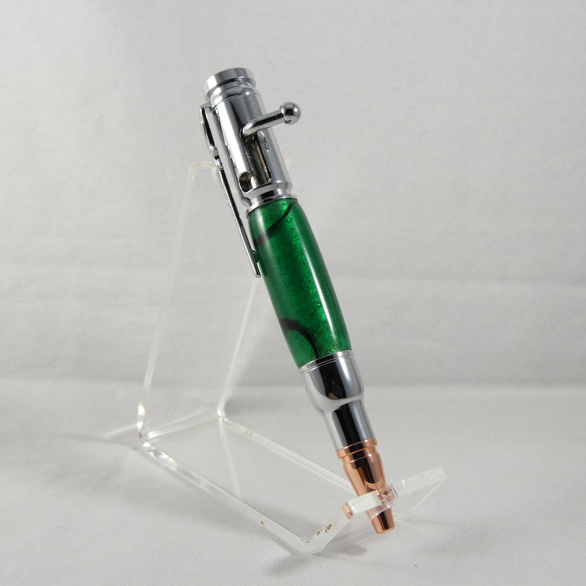 The Bolt Action Mini pen is designed to ensure uniqueness and reliability. The realistic bolt-action will be hard for any hunting or target-shooting enthusiast to put down. The Bolt Action handle smoothly advances and retracts to securely lock the refill in place. Includes a bolt action rifle clip and a replica 30 caliber cartridge.